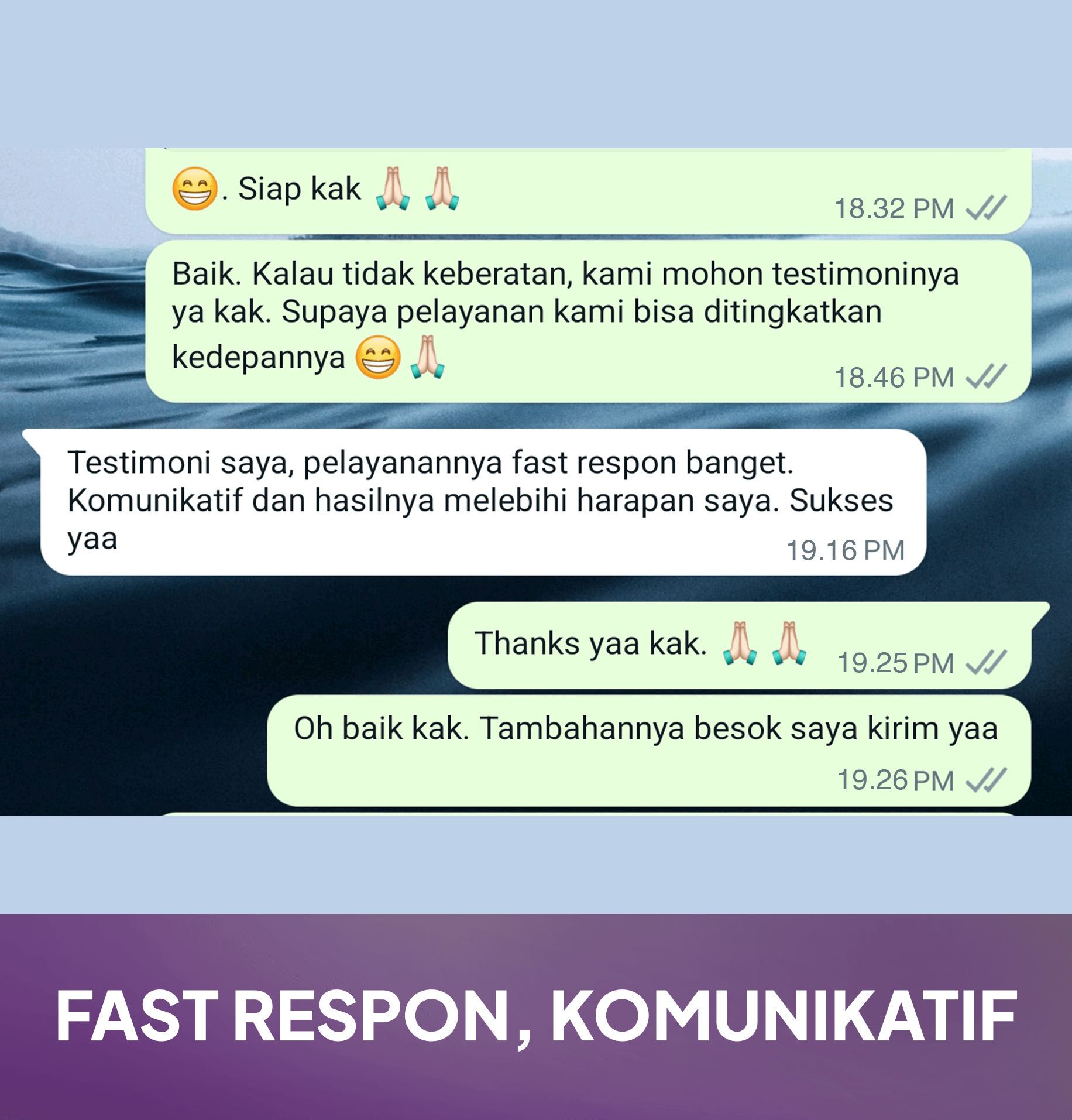 Proses desain cepat dan tepat. Fast respon online 24 jam. Komunikatif, ramah & gesit.